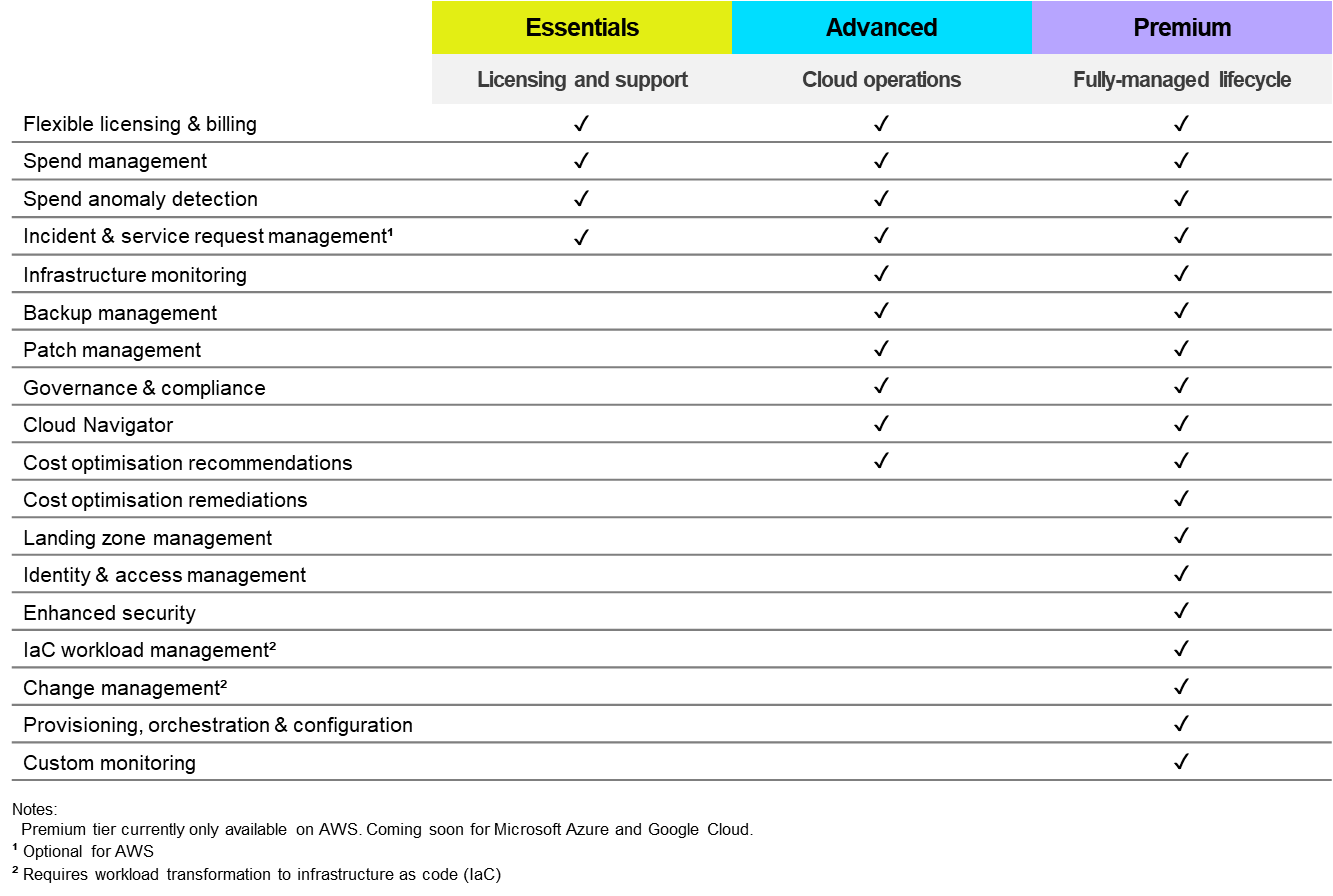 You can compare the features included with each tier of Cloud Managed Services in the table below: