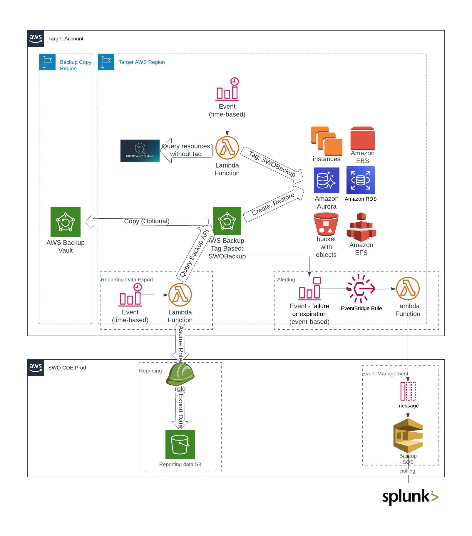 The following table defines AWS Accounts and Regions where AWS Backup will be deployed, as well as default swoBackup tag values for each service in scope.